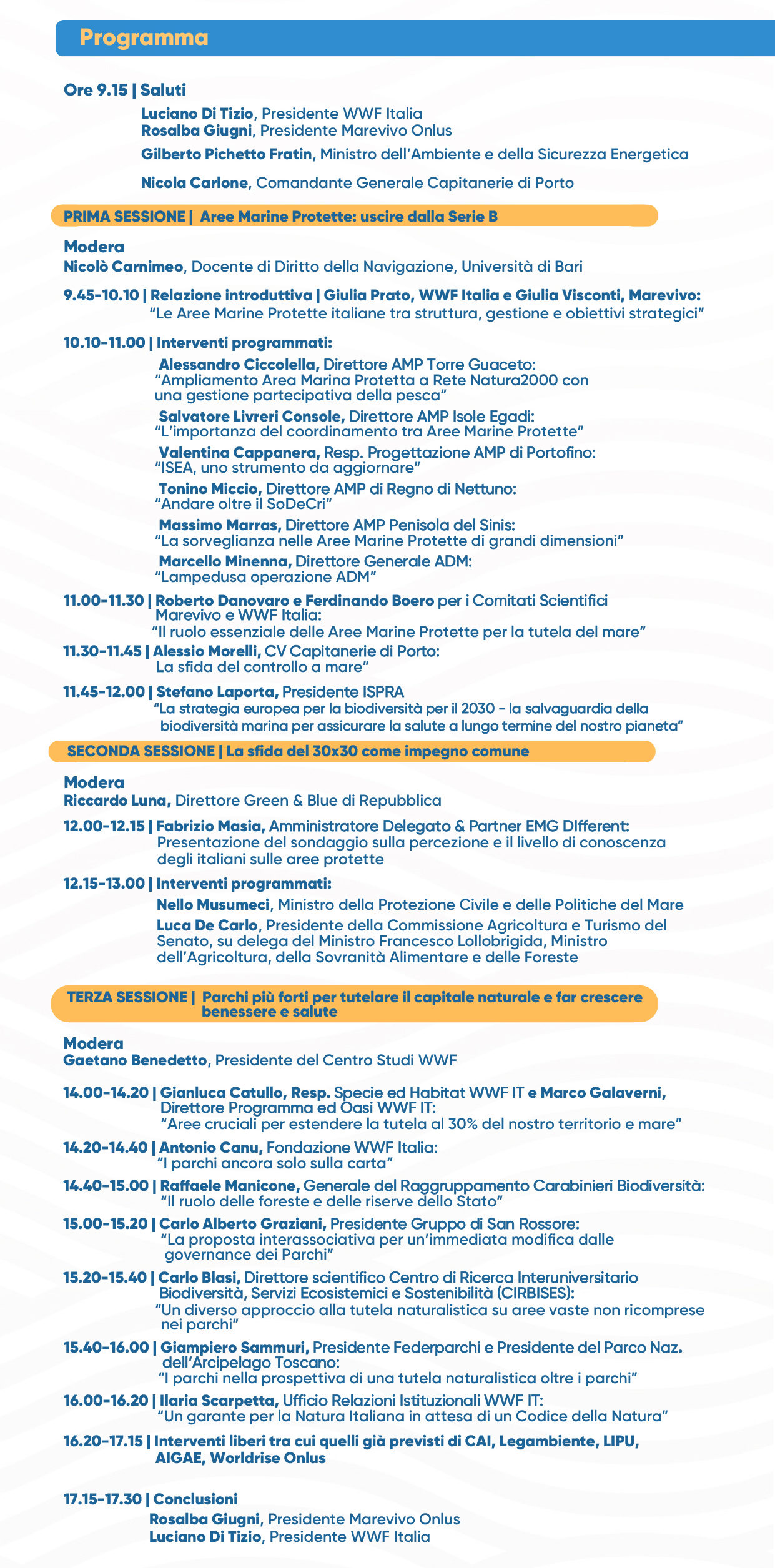 Dal Ministro dell’Ambiente e della Sicurezza Energetica Gilberto Pichetto Fratin al Ministro della Protezione Civile e delle Politiche del Mare Nello Musumeci e dal Presidente della Commissione Agricoltura e Turismo del Senato Luca De Carlo (questi ultimi due protagonisti di una sessione moderata dal direttore di Green&Blue di Repubblica Riccardo Luna), dal Presidente dell’ISPRA Stefano Laporta al Comandante Generale delle Capitanerie di Porto Nicola Carlone, dal Generale dei Carabinieri Forestali Raffaele Manicone al Presidente di Federpachi Giampiero Sammuri, da molti Direttori di Aree Marine Protette ai tecnici di WWF e Marevivo, i professori Carlo Blasi, Direttore scientifico Centro di Ricerca Interuniversitario Biodiversità, Servizi Ecosistemici e Sostenibilità e Carlo Alberto Graziani, Presidente Gruppo di San Rossore, gli interventi hanno sottolineato come l’obiettivo comunitario della tutela estesa al 30% del territorio e del mare rivesta anche un’importante opportunità di carattere economico e di funzionalità rispetto al contrasto al cambiamento climatico.