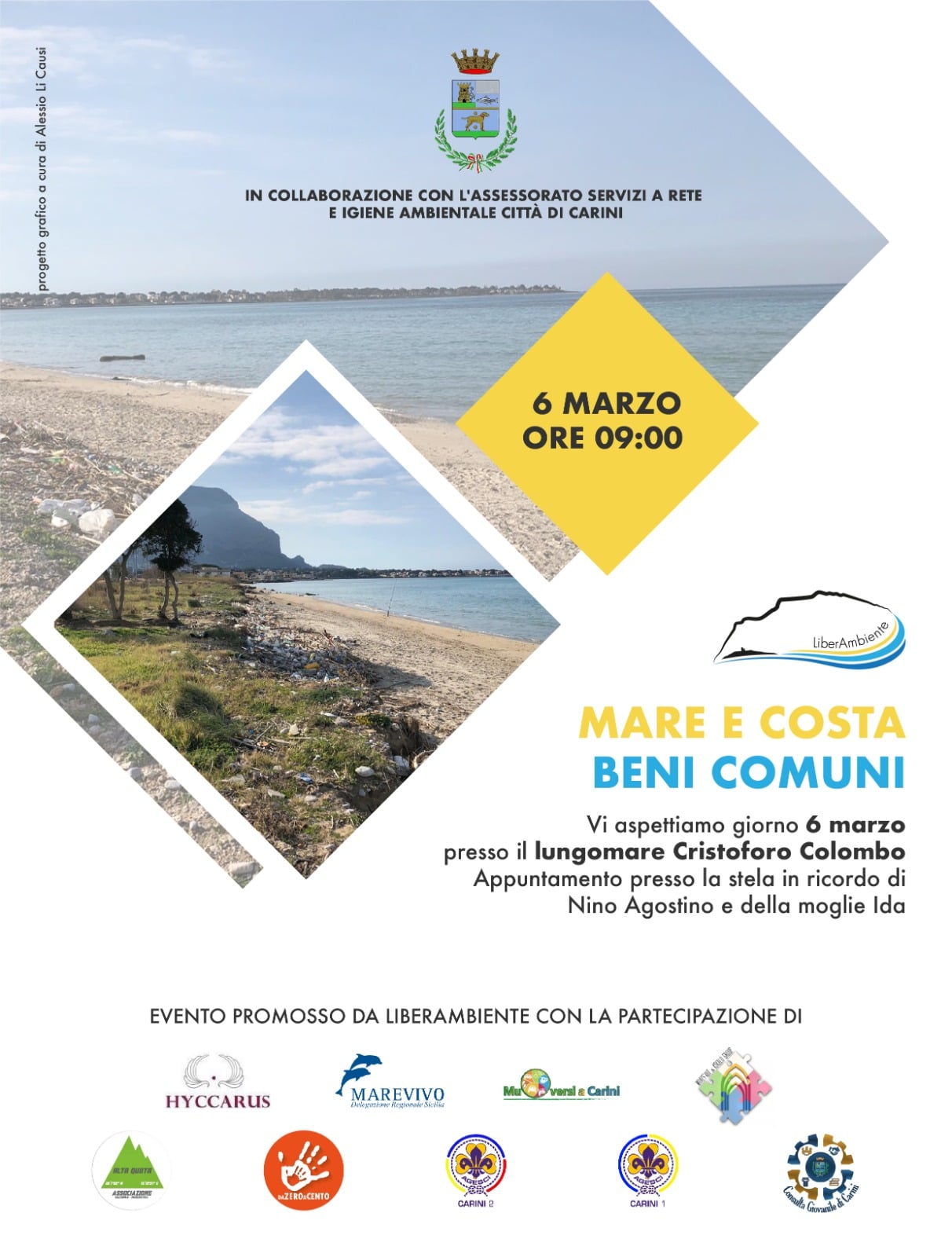 LiberAmbiente insieme agli Amici delle associazioni Alta Quota , Muoversi a Carini, Consulta giovanile di Carini, Hyccarus, Dazeroacento, Marevivo Sicilia, Whats’art & Kokalo group, Gruppo Scout A.G.E.S.C.I. CARINI 1, Gruppo Scout A.G.E.S.C.I. CARINI 2. hanno organizzato uno straordinario evento di pulizia del litorale Carinese.