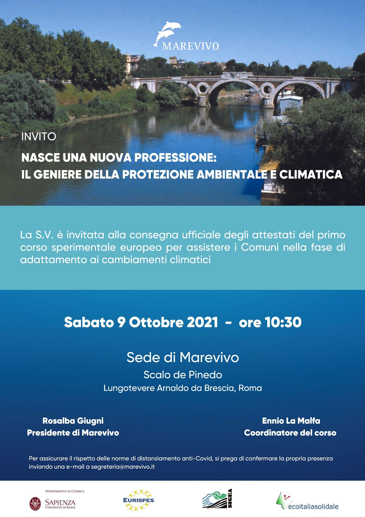 Sabato 9 ottobre, presso la sede nazionale di Marevivo Onlus, nel suggestivo anfiteatro sul Tevere dello Scalo de Pinedo, si svolgerà la consegna ufficiale degli attestati del primo corso sperimentale europeo per Geniere della Protezione Ambientale e Climatica (GPAC), rivolto ai professionisti che assisteranno i Comuni nella fase di adattamento ai cambiamenti climatici.